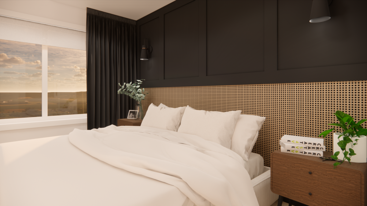 Pale wicker woven cane on black background – bedroomAtelier C3 Design2025-12-15T16:08:43+00:00 Pale wicker woven cane on black background – bedroomProject type: Suggested application in a bedroom: woven wicker cane wallpaper. Buy here