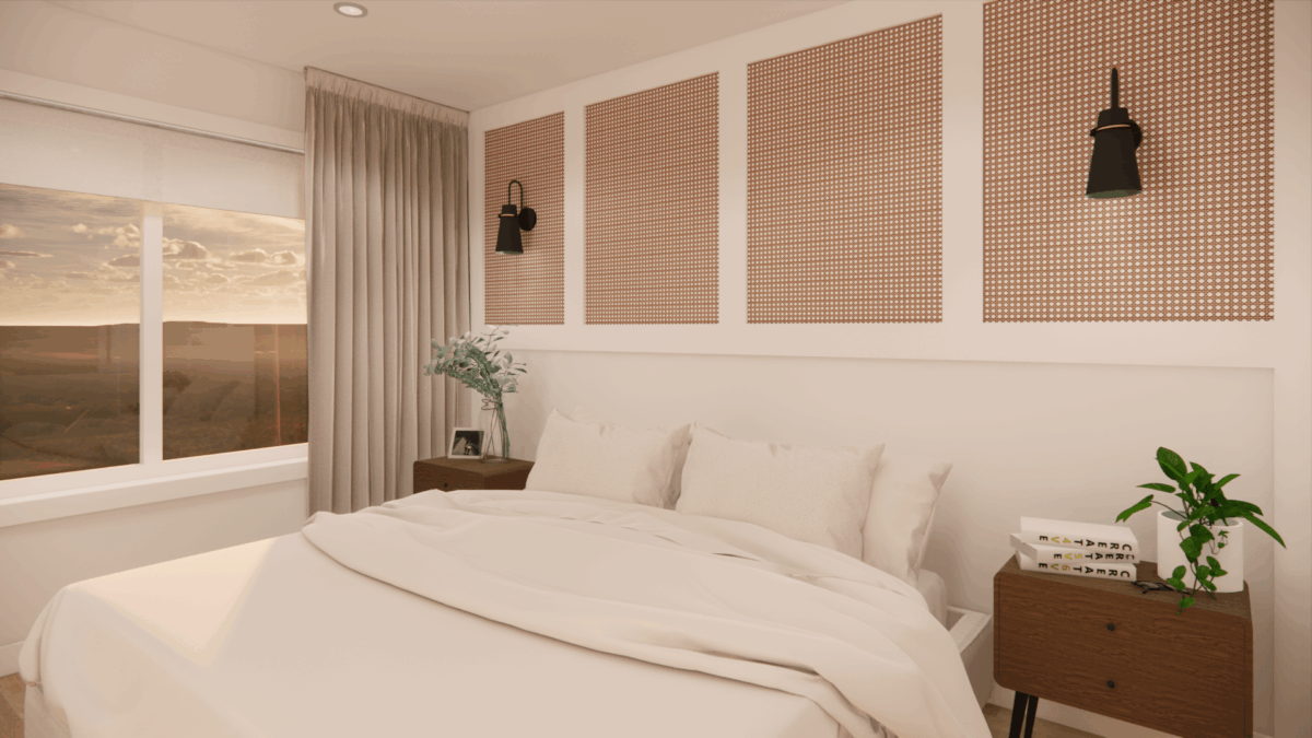 Type de projet : Suggestion d’application dans une chambre : du papier peint en cannage tressé en osier. Disponible ici
